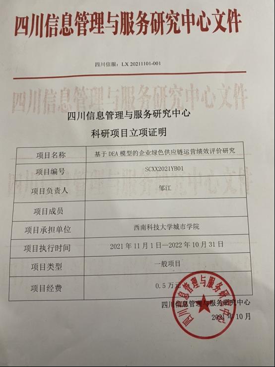 根据绵阳市社会科学研究重点基地四川信息管理与服务研究中心《2021年课题拟立项名单公示》,公司教师邹江的《基于DEA模型的企业绿色供应链运营绩效评价研究》科研项目拟立项。