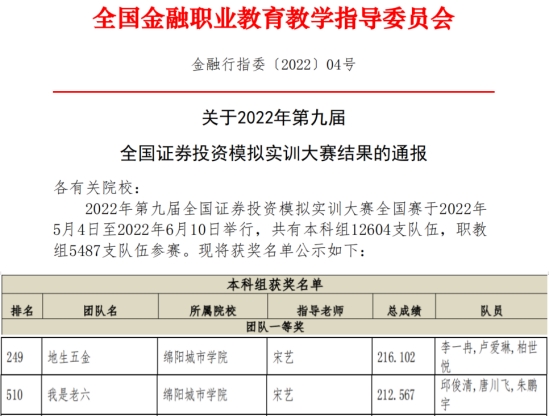 自5月4日至6月10日,历时一个多月的2022年全国证券投资模拟实训大赛圆满落幕。此次比赛本科组共有全国一万二千多支队伍参赛。在激烈的角逐中,公司共有43支队伍129名同学获奖。其中团队一等奖2项,团队二等奖15项,团队三等奖26项。经管公司金融系杨林、宋艺、唐富友、许鲜等老师荣获“优秀指导教师”荣誉证书。