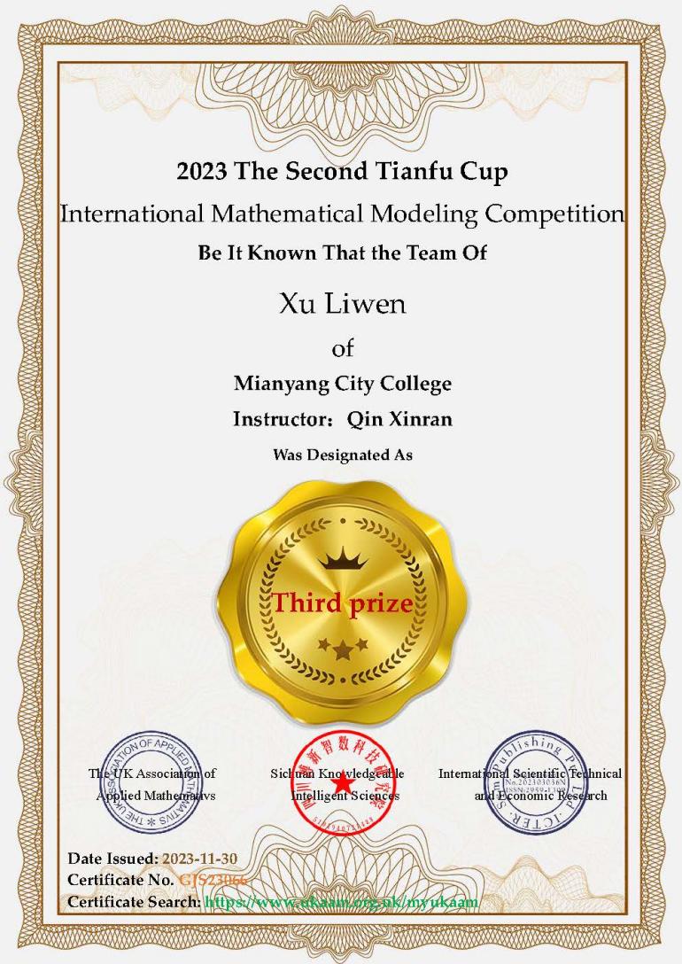 近日,第二届天府杯全国老员工数学建模国际赛圆满结束,mk体育官方网站入口员工徐俪文在教师秦昕然的指导下,荣获三等奖。本次比赛吸引了多所“双一流”高校参赛,被视为国内高校综合测评、创新奖学金等评定竞赛的重要参考之一。