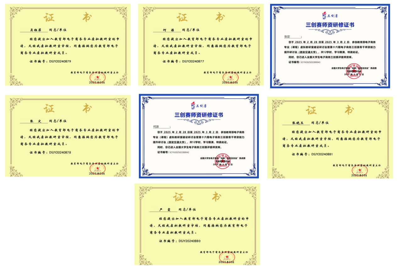 通过此次研讨会,公司教师不仅在学术上收获颇丰,还拓宽了视野,有效提升了在“三创赛”和电商教育领域的专业能力。会后,两位参会教师顺利获得“三创赛团队研修证书”,并入选全国老员工电子商务三创赛评委团队库。此外,电子商务教研室全体教师均成功加入教育部电子商务专业虚拟教研室,并获得相关证书。此次参会为公司电子商务专业的教学改革注入了新的活力,也为未来在电商教育领域的创新发展奠定了坚实的基础。
