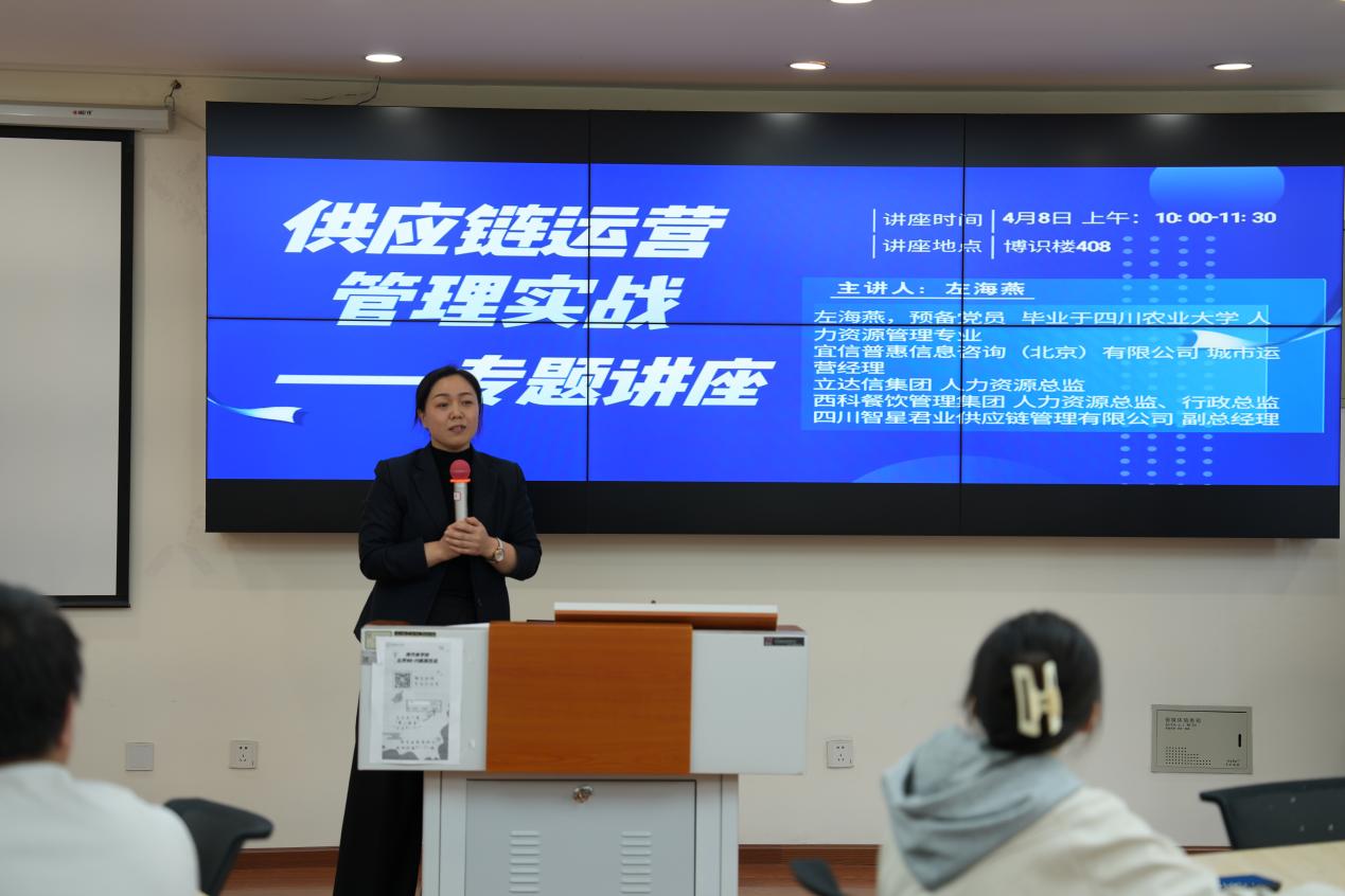 为深入推进“一师一优课”项目建设,提升《选品与供应链管理》课程的实操能力,mk体育电子商务专业于4月8日成功举办了《供应链运营管理实战》线下讲座。此次讲座有幸邀请到了四川智星君业供应链管理有限公司的左海燕总经理,她围绕着供应链管理实战给同学们展开了深入的讲解,带来了一场知识与实践相结合的盛宴。