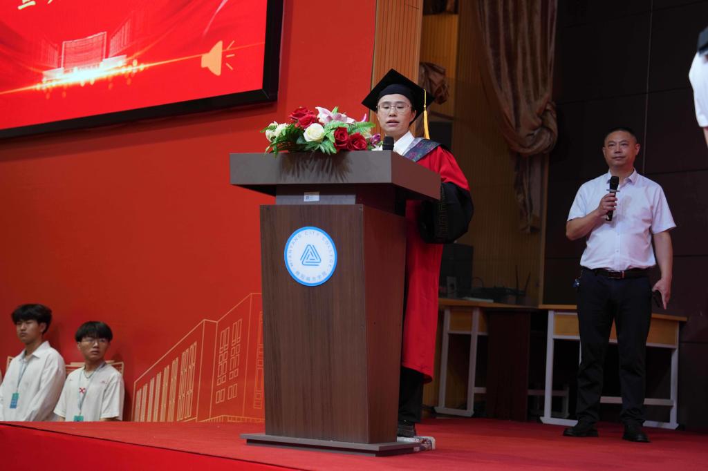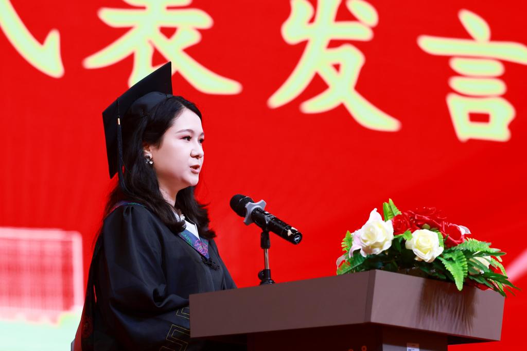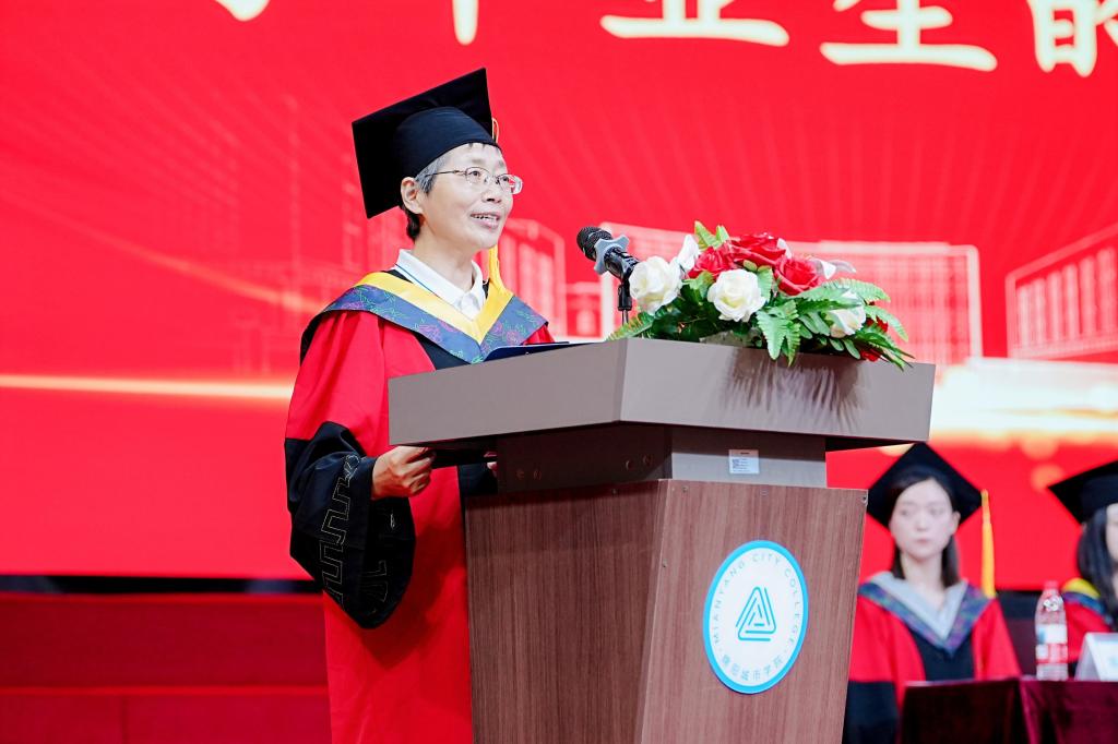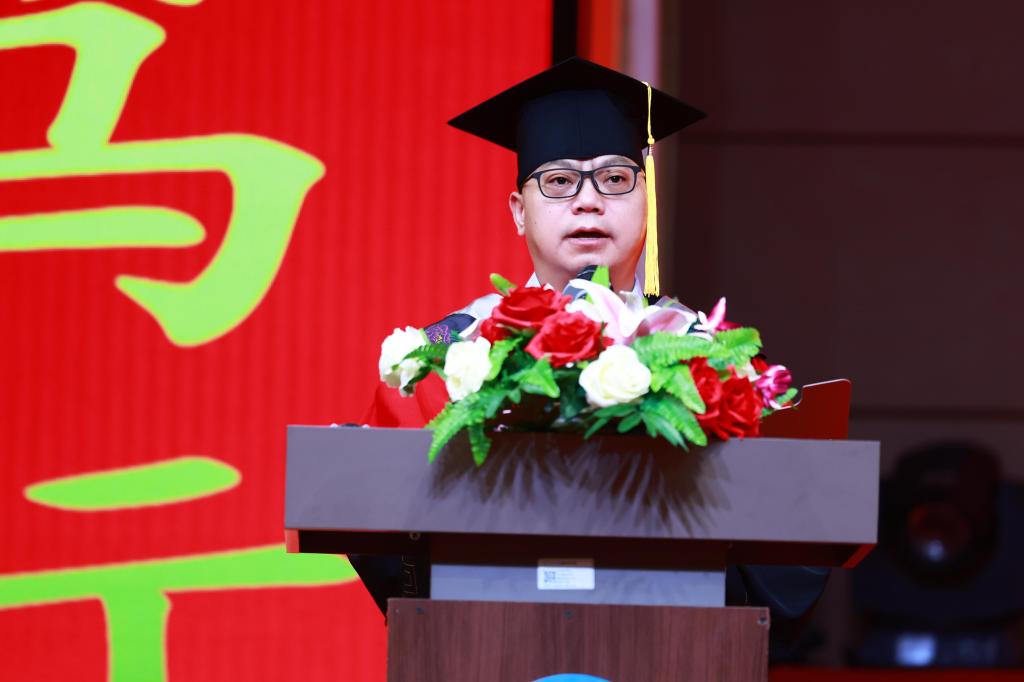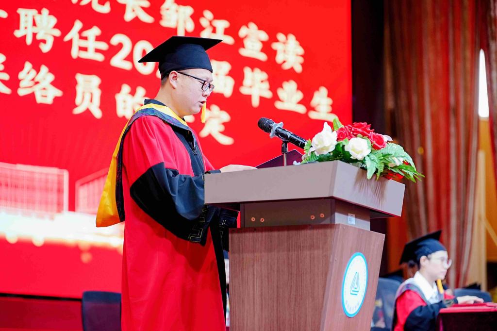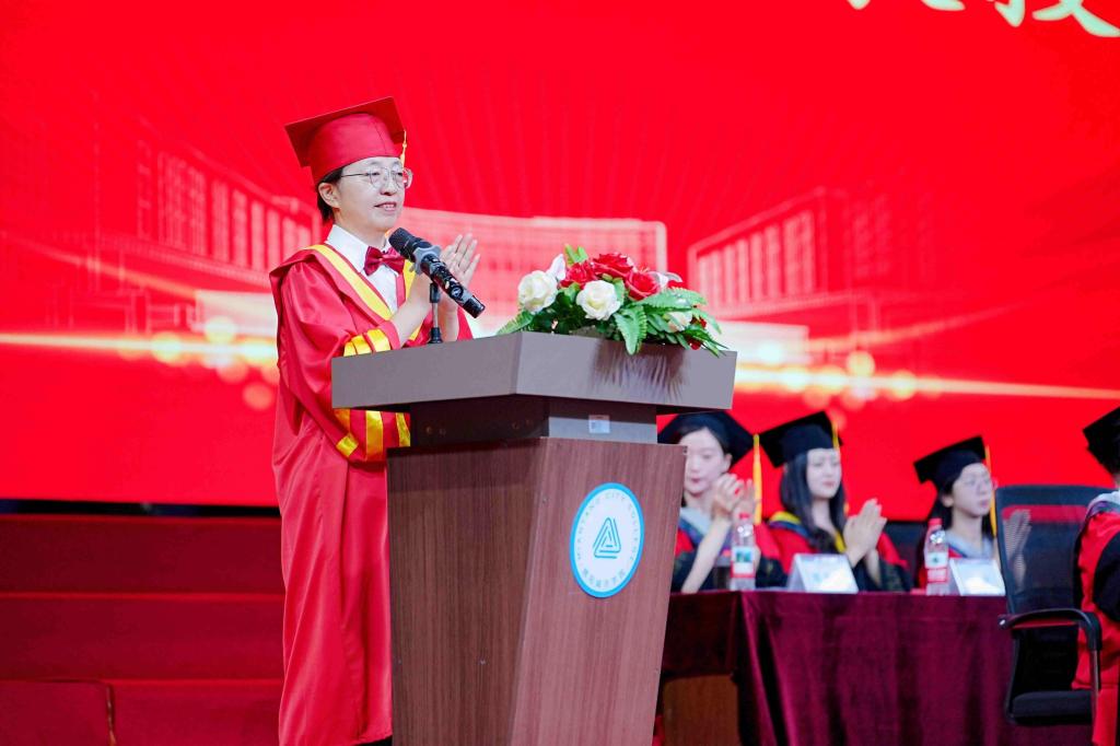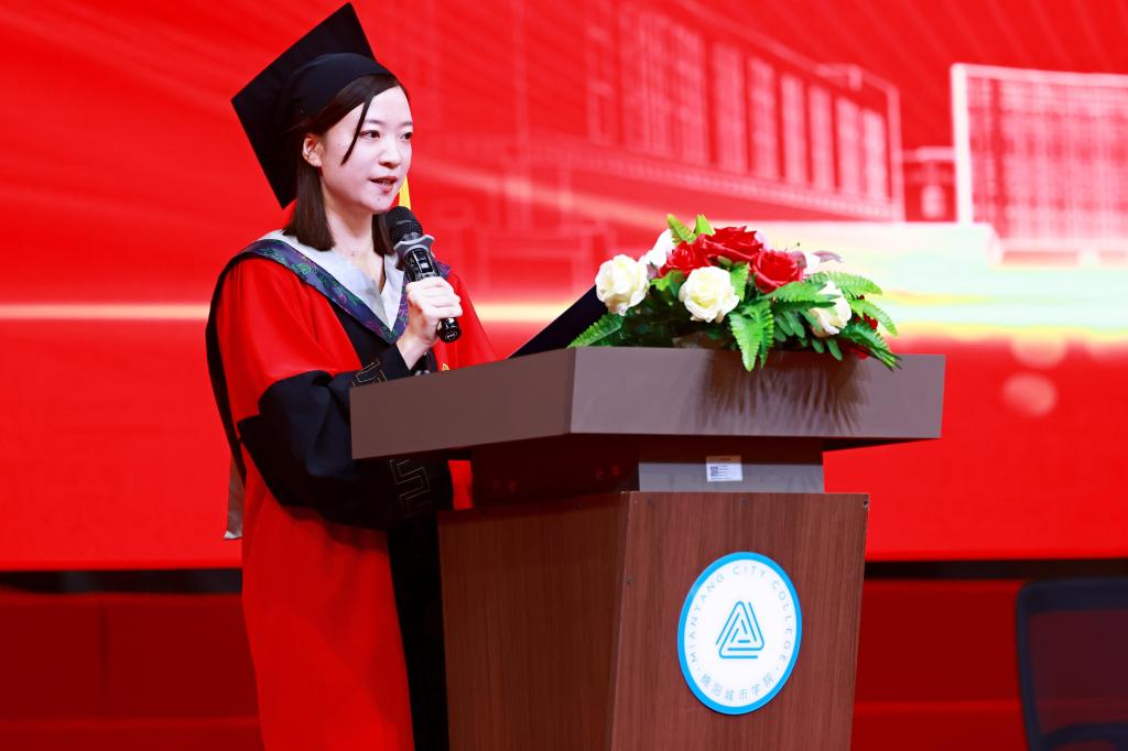 教师代表邓琦莉以饱含深情的发言,回顾了与员工们相处的点滴,寄语毕业生们永葆求知热情与责任担当;叮嘱同学们在未来要牢记母校教诲,秉持求真务实的态度,踏实做事、诚信做人,无论身处何方,都要心系母校,常回“家”看看。