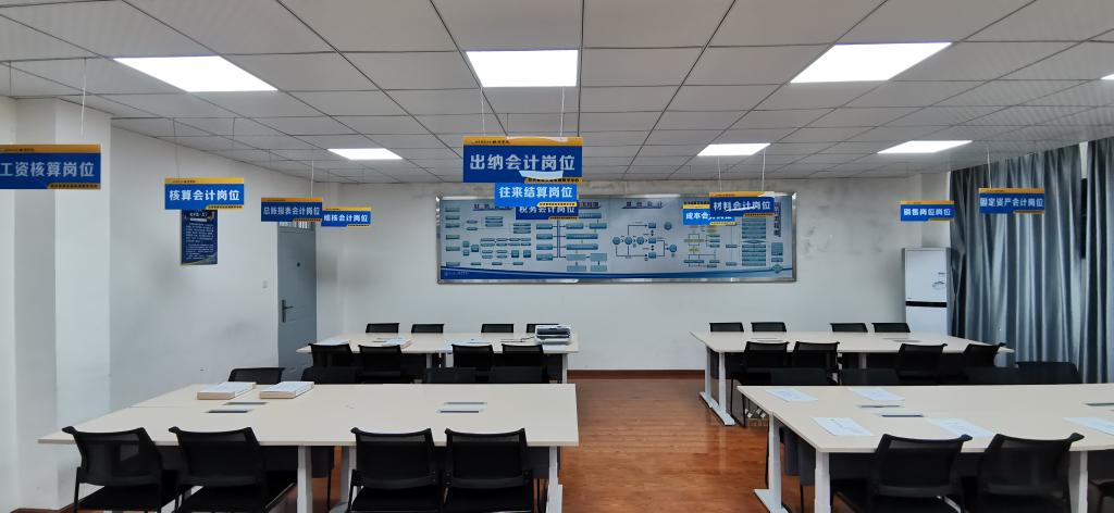 财会综合实训室建立于2018年,投资60余万元,实训室总面积约为160平米,可容纳80余名员工同时开展实训教学。