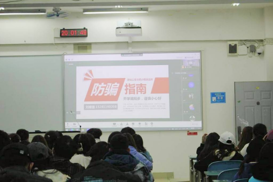 刘珊珊警官以双十一购物节为出发点,讲了网上购物存在的诈骗风险,用最贴近生活的案例让同学们意识到网络诈骗的危害。刘警官着重分析了被诈骗人的心理因素,并告诫大家不要企图贪小便宜。此外,刘警官还列举了广告植入、中奖短信、小程序植入、校园贷等各种层出不穷的电信网络诈骗方式,让同学们认识到了网络诈骗活动的多样性。宣讲活动最后,刘警官还呼吁同学们下载“反诈APP”,以提高对新型诈骗的防范意识和警惕意识,共同维护社会治安稳定。