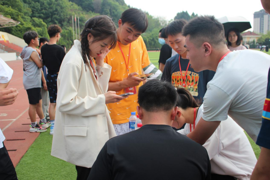 当然同样需要技巧的也有800m、1000m的长跑项目和铅球,赛场上的选手蓄势待发。场外的应援也绝不落后,同学们各显神通,用不同的方式给我们的选手加油打气。同时,学工中心林海主任也来到比赛现场,陪同选手们比赛,给他们加油鼓劲。