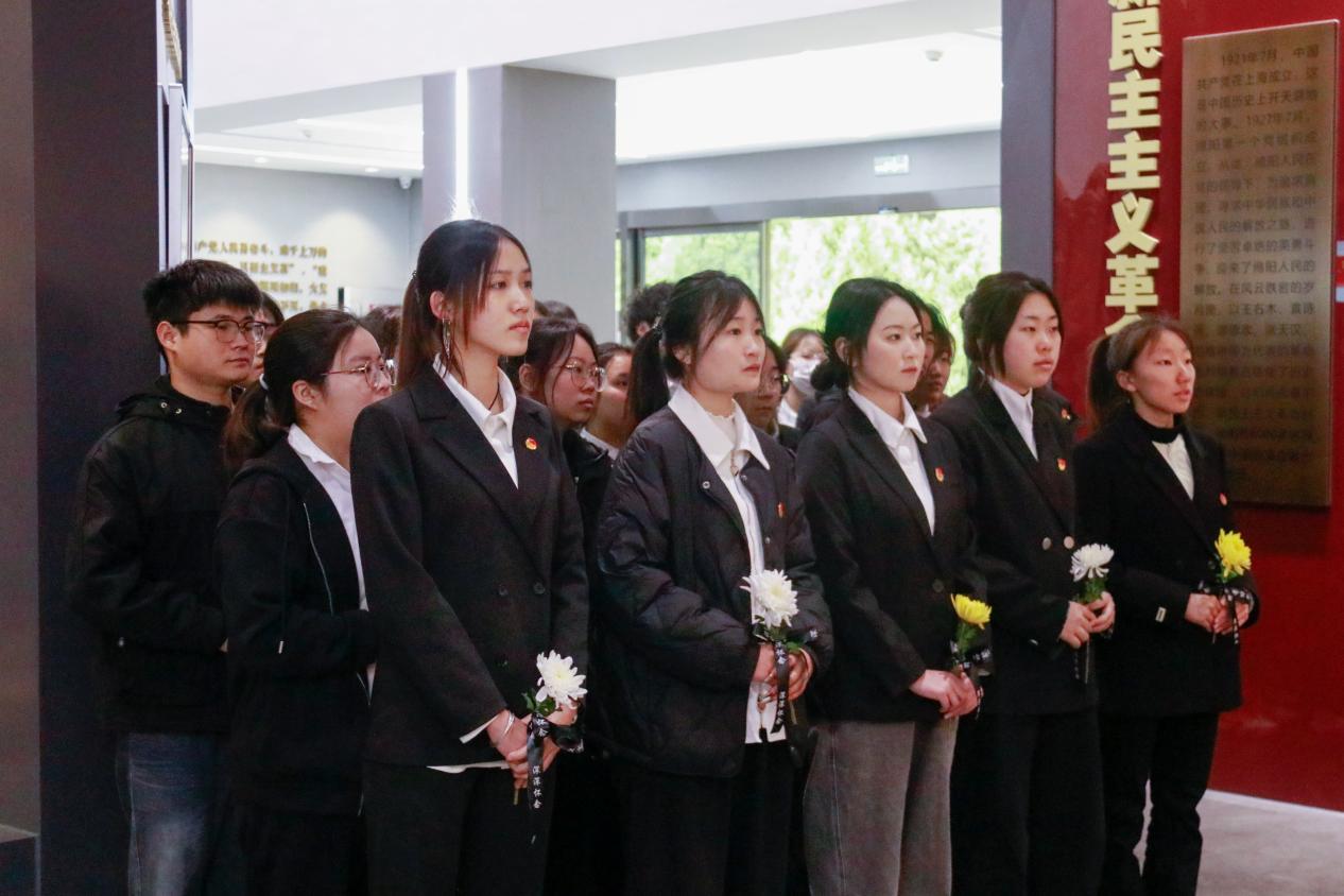 参观完纪念馆后,志愿者们心怀崇敬,移步至烈士纪念碑前。全场静默,全体人员低头垂首,进行了庄严的三分钟默哀,表达对革命先烈最深沉的敬意与怀念。随后,伴随着《献花曲》悠扬而庄重的旋律,志愿者们踏着沉稳的步伐,沿着石阶缓缓而上,每个人的手中都紧握着一束素雅的菊花。在纪念碑前,他们轻轻地将鲜花放下,每一朵都承载着同学们对革命先烈无尽的追思与深刻的缅怀,仿佛是对英雄们最真挚的致敬与告慰。