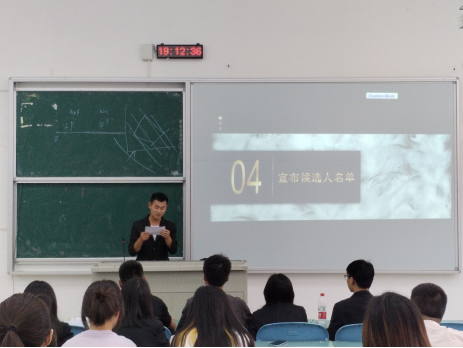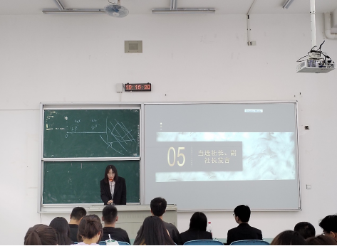 紧接着进行的就是激烈的精竞选环节,每一位参与的选手在讲台上都如鱼得水,操纵自如,在三尺讲台上闪耀着属于自己的光辉。他们慷慨激昂的演讲,精美绝伦的PPT,以及自然顺畅的演讲,无一不在展现出自己的自信和对社团认真负责的态度,我们社团正是需要拥有这样自信性格和认真态度的干部。在同学精彩的演讲之后,由前任社长以及社团核心干部对同学们的展示进行了商定讨论,最终确定了新任干部的名单。