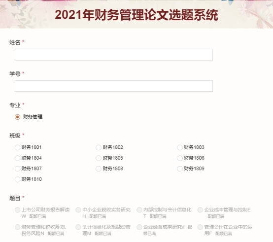 今年同学在选题时,本系统快速清晰的列出了每个专业的毕业论文题目名称以及可选数量。同学们可以在互联网上直接用手机或电脑填好自己的相关信息,并选定自己的毕业论文题目提交。