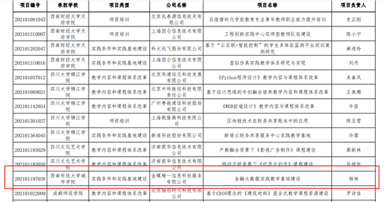 日前教育部高等教育司公布了2021年第一批产学合作协同育人项目立项名单(教高司函[2021] 14号),mk体育官方平台(原西南科技大学城市公司)金融系申报项目——“金融大数据实践教学基地建设”,顺利通过教育部立项。